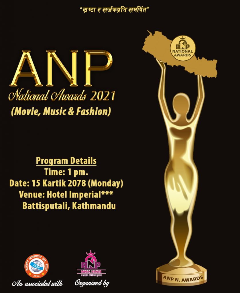स्रष्टा र सर्जकको सम्मानमा पहिलोपटक एएनपी नेशनल अवार्डस–२०२१ आयोजना गर्न लागिएको आयोजक संस्थाका अध्यक्ष लबबहादुर कार्कीले जानकारी गराएका छन्। उनका अनुसार आगामी कात्तिक १५ गते राजधानीको बत्तीसपुतलीस्थित तीनतारे होटल इम्पेरियलमा आयोजना गरिने कार्यक्रममा विभिन्न क्षेत्रमा क्रियाशिल स्रष्टा र सर्जकलाई सम्मान गरिनेछ भने चलचित्र, संगीत र फेसनको क्षेत्रमा विभिन्न विधामा अवार्ड प्रदान गरिनेछ। यसका लागि निःशुल्करुपमा आवेदन भर्न सकिने कार्कीले जानकारी गराए। उनका अनुसार फेसन क्षेत्रअन्र्तगत मोडल र कोरियोग्राफरका अलावा इभेन्ट आयोजक तथा व्यबस्थापकहरुलाई समेत प्रोत्साहित गर्न ती विधामा समेत अवार्डको ब्यबस्था गरिएको छ। शम्भुप्रसाद रेग्मीको संयोजनमा हुने कार्यक्रममा विभिन्न मनोरञ्जक प्रस्तुति प्रस्तुत गरिने अध्यक्ष कार्कीले जानकारी गराए।